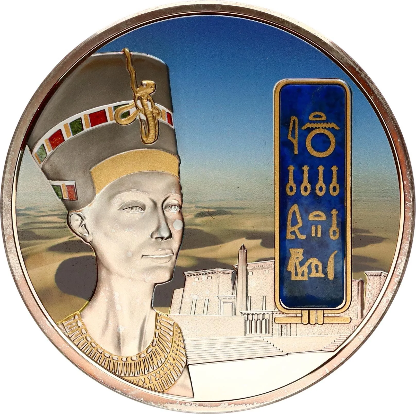 Nefertiti head plaque. Lapis lazuli, 35.15 x 12.10 mm, with gold details on headdress, necklace, and lettering.