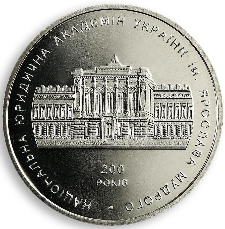 The coin shows the academy's building encircled by "НАЦІОНАЛЬНА ЮРИДИЧНА АКАДЕМІЯ УКРАЇНИ ІМ. ЯРОСЛАВА МУДРОГО," with "200 РОКІВ" below it.