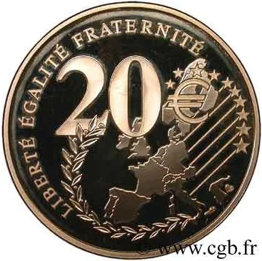 2002 European Union map, featuring a €20 face value, an olive branch, and the EU's twelve stars.