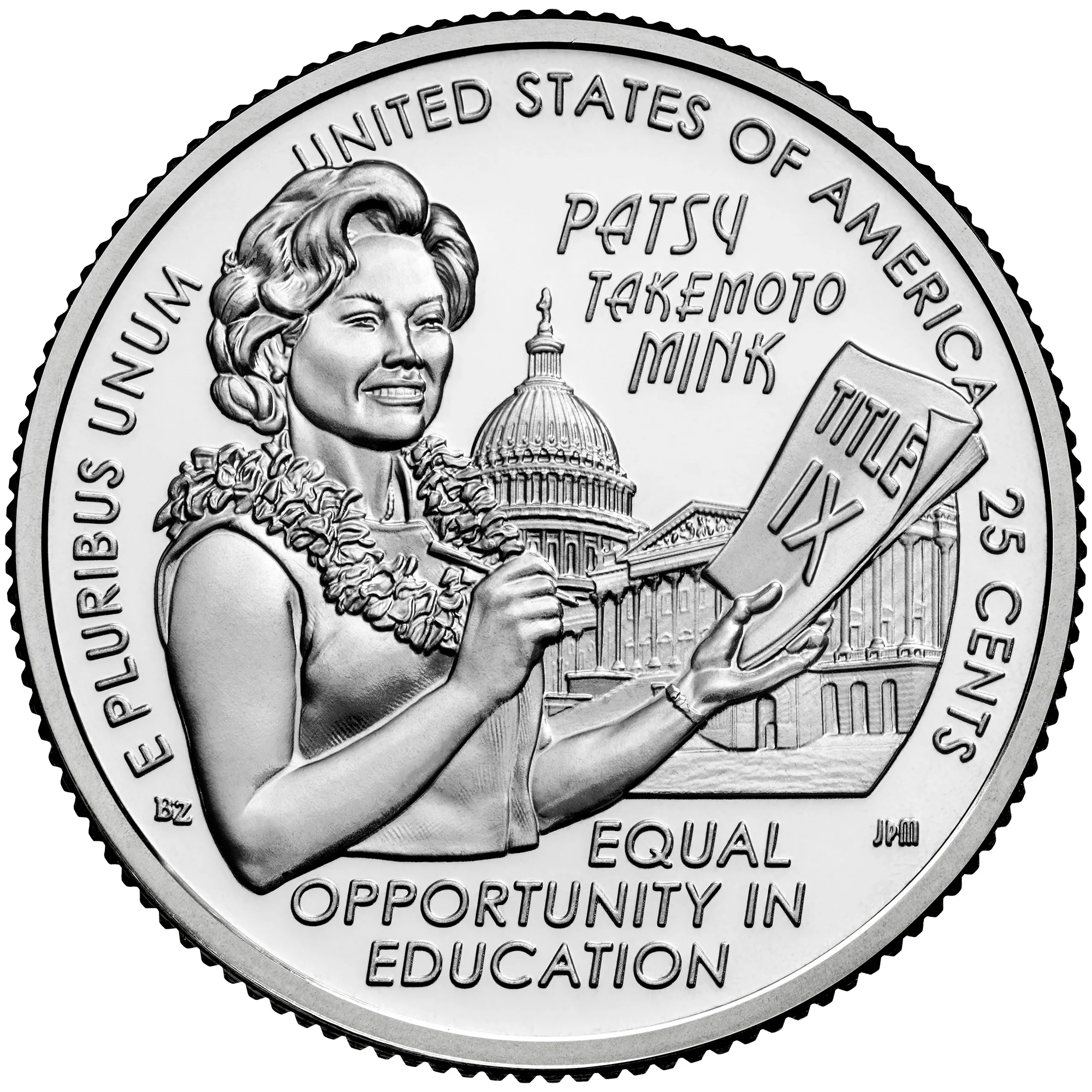Patsy Takemoto Mink holding her Title IX legislation, with the U.S. Capitol behind her. The lei represents her home state of Hawaii.
