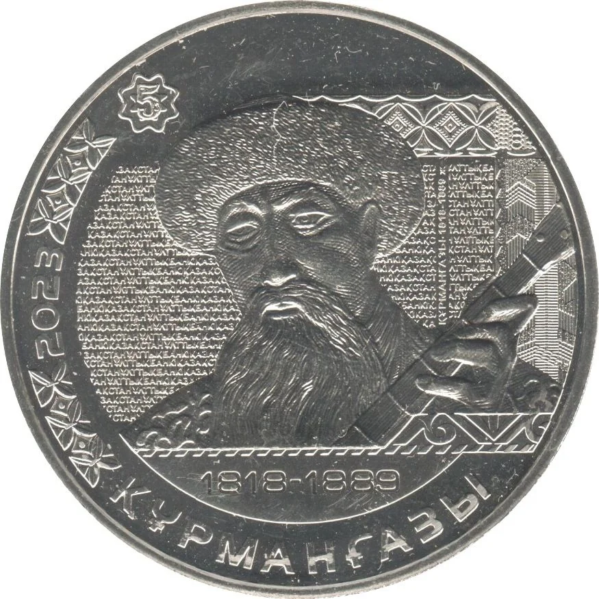 The coin's center features a portrait of folk musician Kurmangazy, adapted from the 1993 5-tenge banknote. His lifespan is below the portrait, the issue year is to the left, and "ҚҰРМАНҒАЗЫ" is inscribed at the bottom.