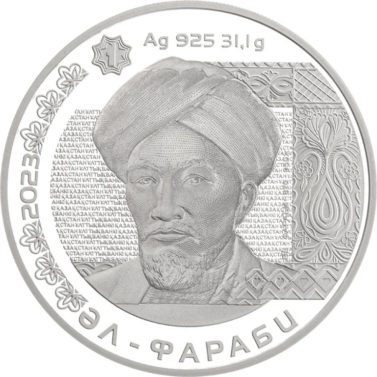 Description: The coin's center features a portrait of Al-Farabi, adapted from the 1993 1-tenge banknote. The top shows the metal, fineness, and weight, while the left side displays the issue year and the bottom bears the inscription "ӘЛ-ФАРАБИ."