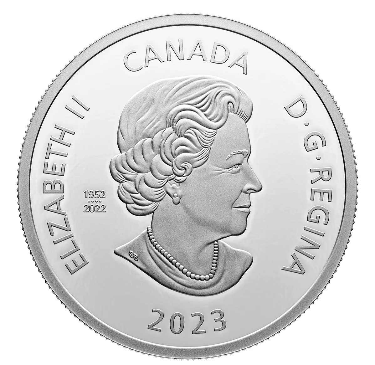 Queen Elizabeth II at 77, facing right, wearing a necklace and earrings. The effigy includes the dates "1952" and "2022," separated by four pearls representing her four Canadian coin portraits.