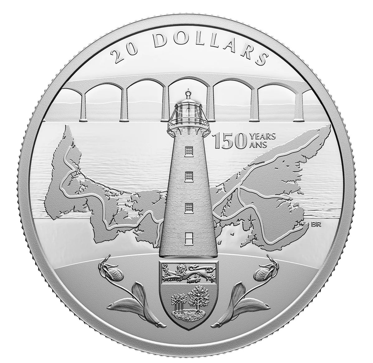 The reverse depicts iconic provincial symbols and landmarks, from heritage lighthouses to the Confederation Bridge, representing over 150 years of P.E.I. history.