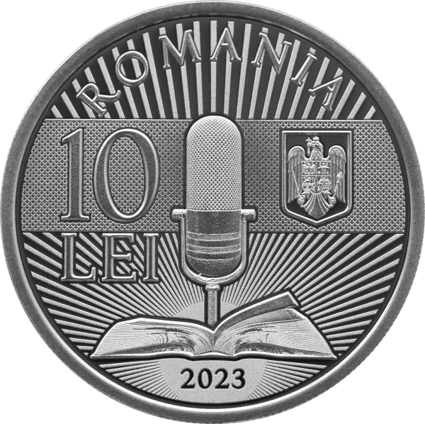 A 2023 Romanian 10-leu coin featuring a radio studio microphone, a book, and the national coat of arms.