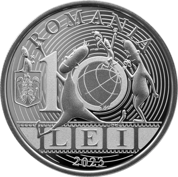 Ion Popescu-Gopo's animated character (Omulețul) in various poses, with a globe and film, the word "ROMANIA" in an arc, Romania's coat of arms, the value "10 LEI", and the year "2023".