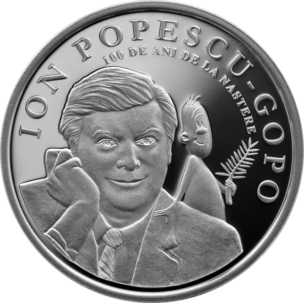 Portrait of Ion Popescu-Gopo with his character, encircled by the text "ION POPESU-GOPO" and "100 YEARS FROM BIRTH".