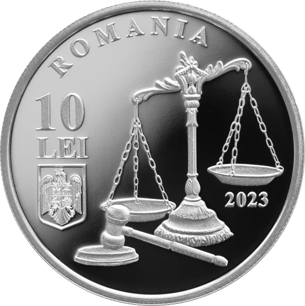 Romania's 2023 10 Lei coin features scales, a judge's gavel, the national coat of arms, and the inscription "ROMANIA".