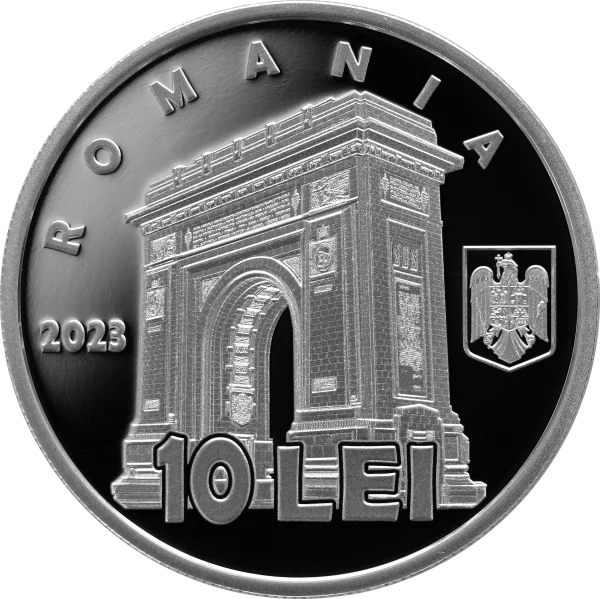 Architect Petre Antonescu's Arch of Triumph in Bucharest, with "ROMANIA" inscribed on its arch. Includes the year 2023, Romania's coat of arms, and the value 10 LEI.