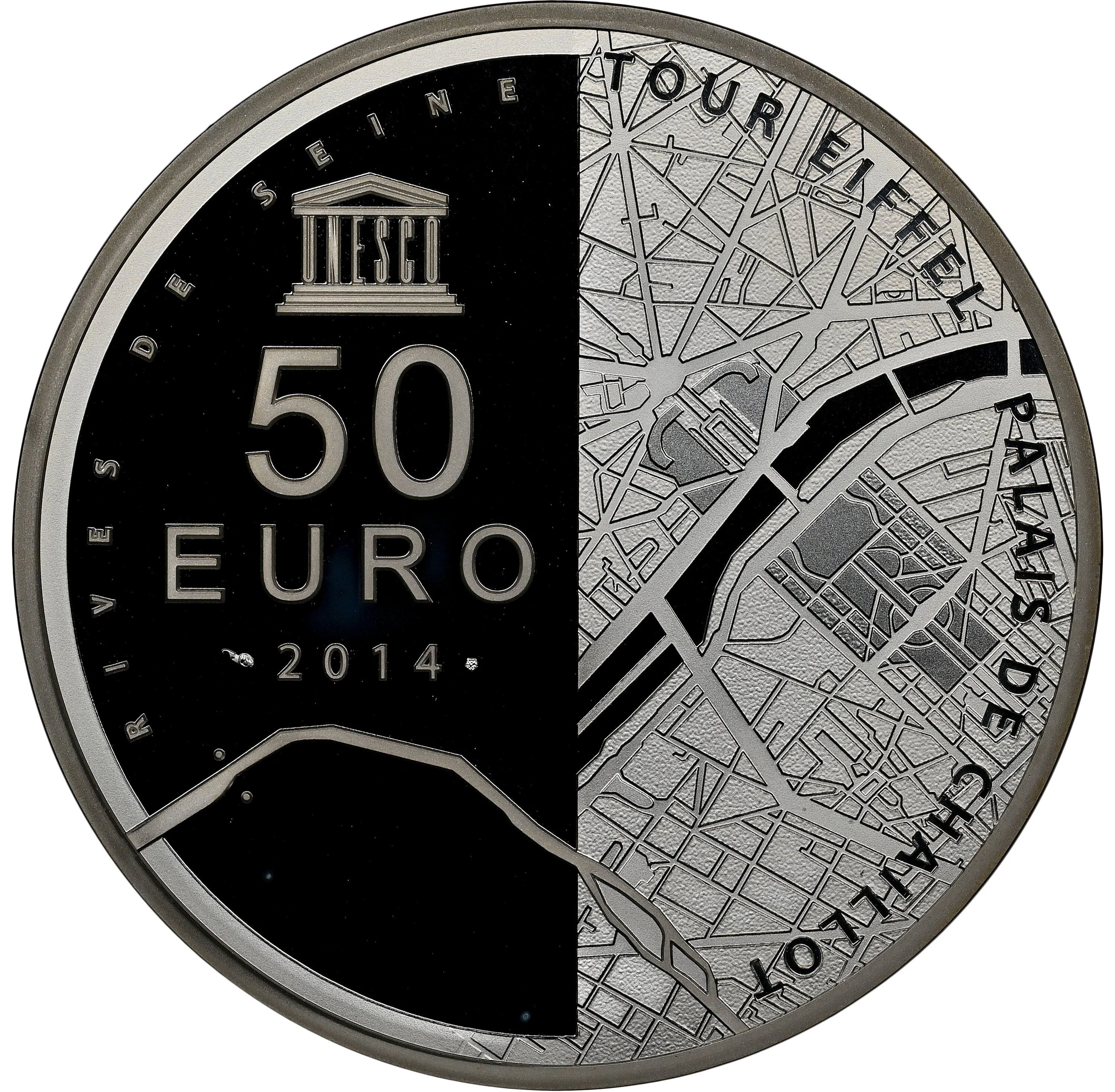 Right: Paris map with Eiffel Tower and Palais de Chaillot. Left: UNESCO logo, "50 EURO," and year.