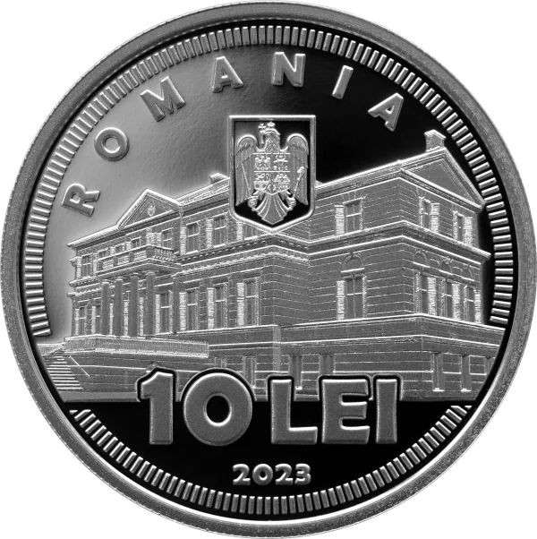 Săvârșin Castle, "ROMANIA," the Romanian coat of arms, face value "10 LEI," and issue year "2023."
