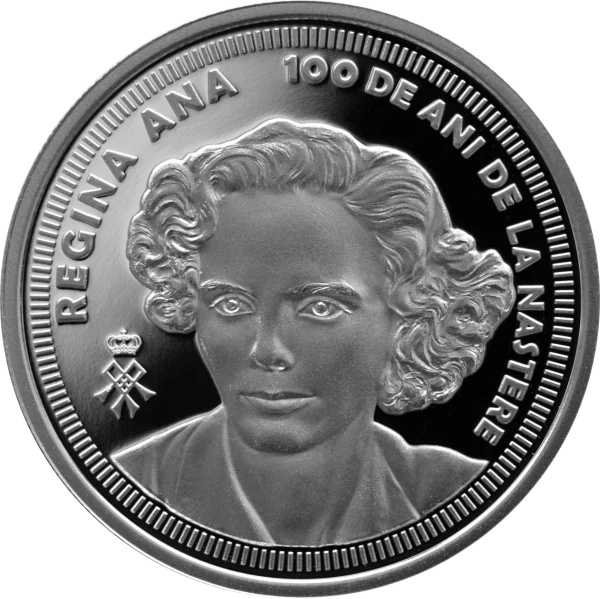Queen Ana's portrait and monogram, with the inscriptions “REGINA ANA” and “100 DE ANI DE LA NASTERE”.