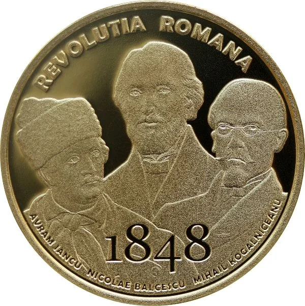 Portraits of Romanian revolutionaries Avram Iancu, Nicolae Bălcescu, and Mihail Kogălniceanu, with "REVOLUTIA ROMANA" and "1848".