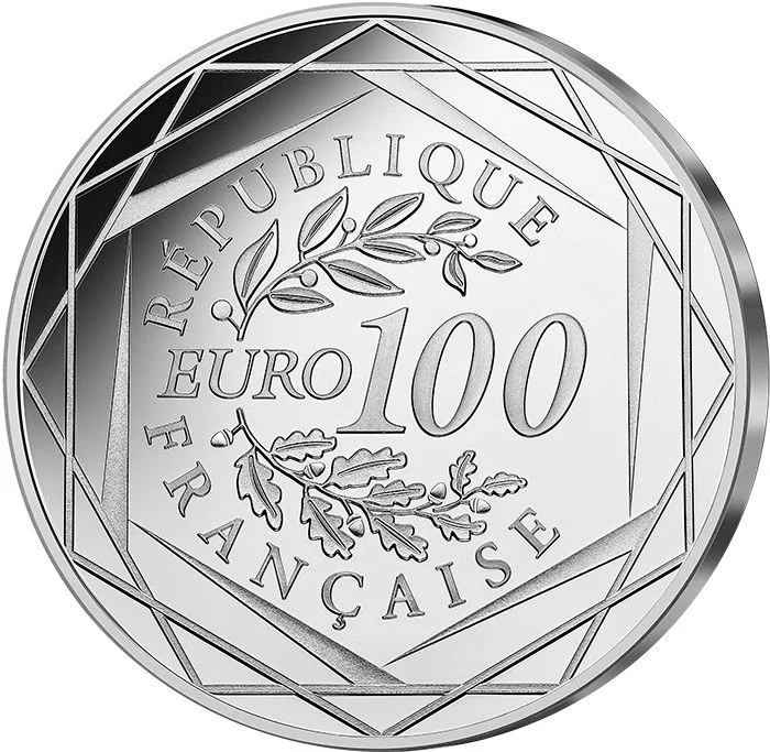 Laurel and oak branches frame the face value, surrounded by the inscription "RÉPUBLIQUE FRANÇAISE" and three hexagons.
