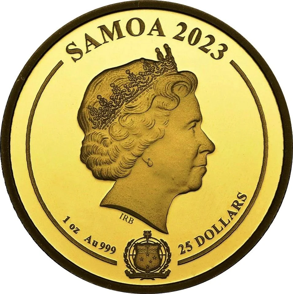 Queen Elizabeth II facing right, Samoan coat of arms below.