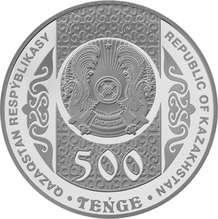 The central coat of arms of Kazakhstan is flanked by national ornament, encircled by the inscriptions "QAZAQSTAN RESPÝBLIKASY" and "REPUBLIC OF KAZAKHSTAN," with the coin's denomination at the bottom.