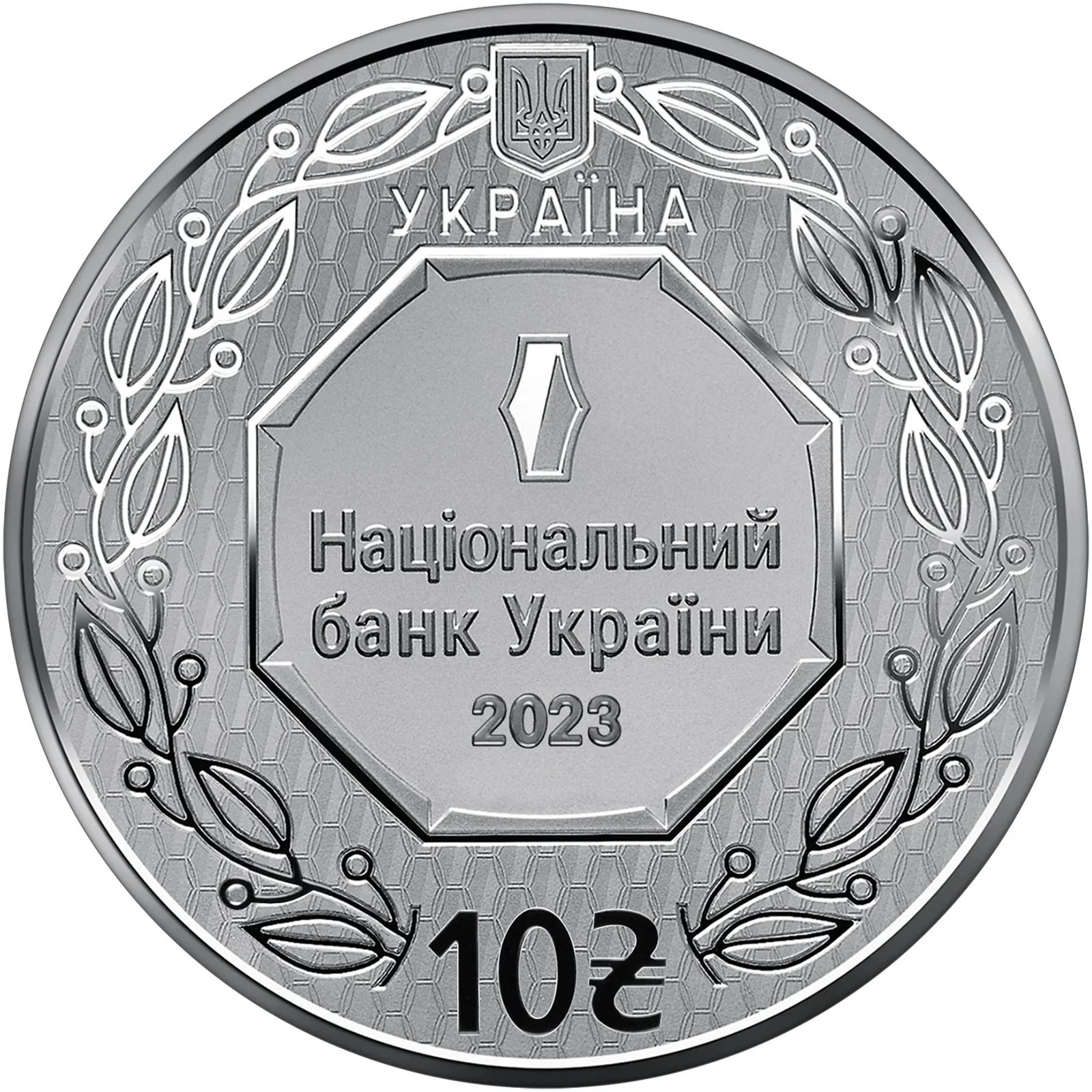 The obverse features Ukraine's small coat of arms and the word "УКРАЇНА" above a circular field of stylized Kyivan Rus hryvnia patterns. A laurel wreath encircles the central octagonal cartouche, which contains the logo on a mirrored background and the text "НАЦІОНАЛЬНИЙ БАНК УКРАЇНИ 2023". The denomination "10" and the hryvnia symbol are at the bottom.