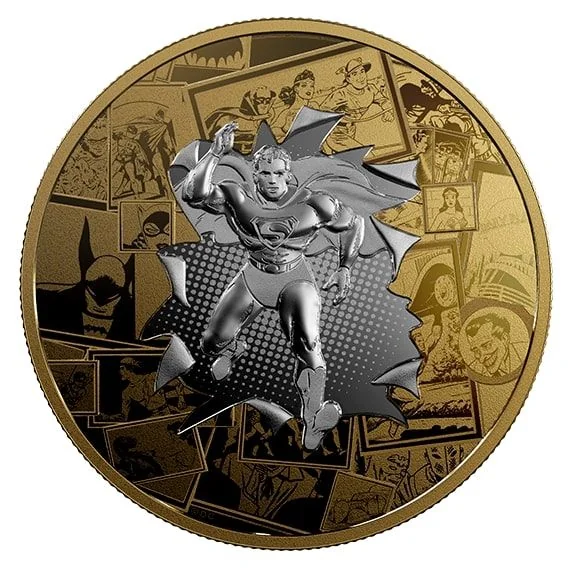 Superman bursting through gold-engraved comic panels.