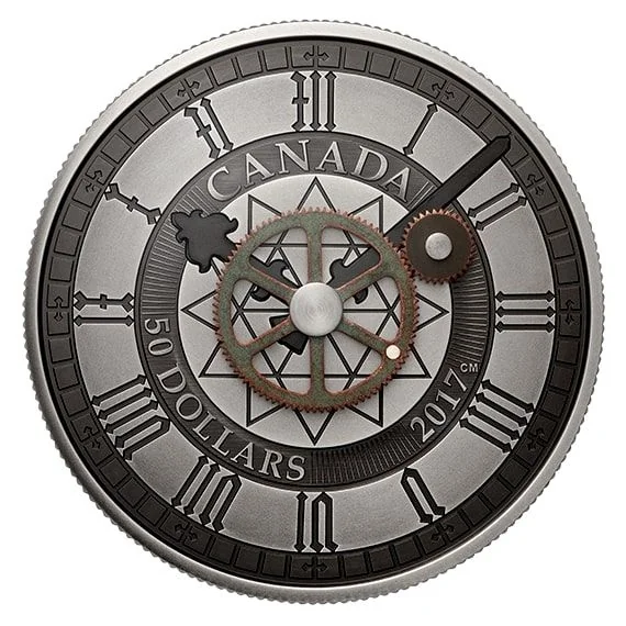 Engraved clock face with gears from oxidized Parliament roof copper.