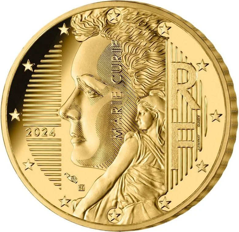 Portrait of Marie Curie as the Sower, facing left amid rays and the EU's twelve stars.