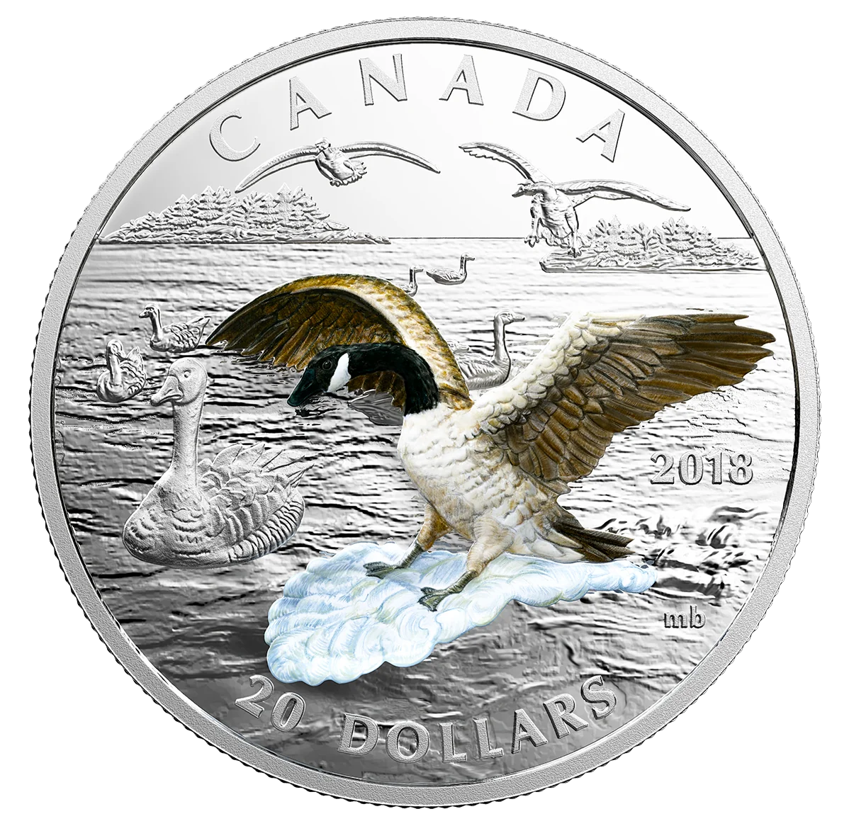 A 3-D rendered Canada goose coin lands on a lake.