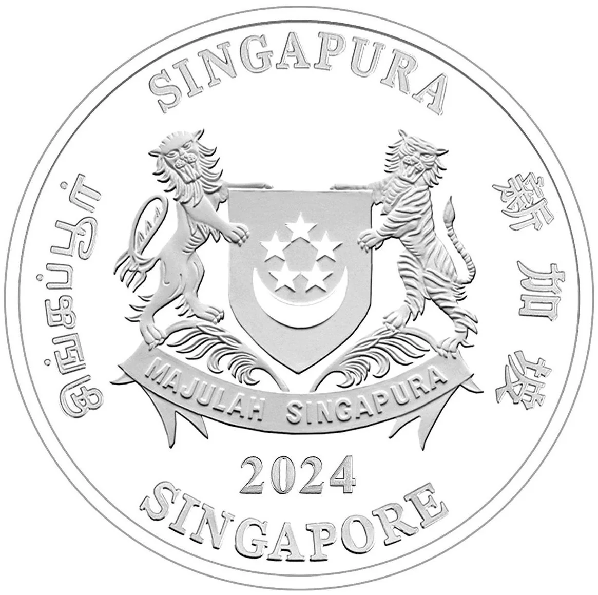 Emblem with date; 'Singapore' encircles it in English, Tamil, Chinese, and Malay.