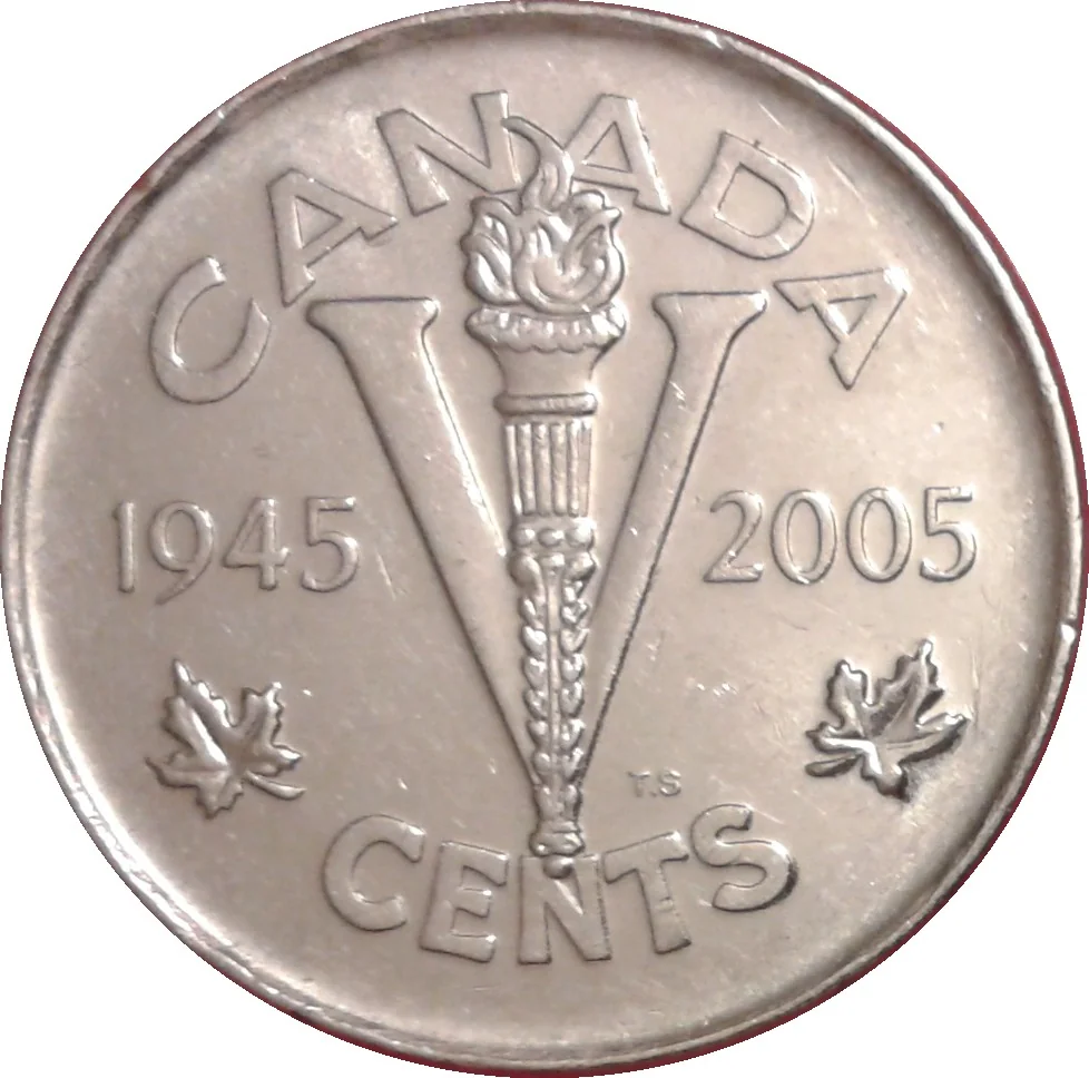 1945 coin reproduction: central "V" for victory/value above "CENTS," flanked by maple leaves and a torch, with "CANADA" above and dates "1945" and "2005."