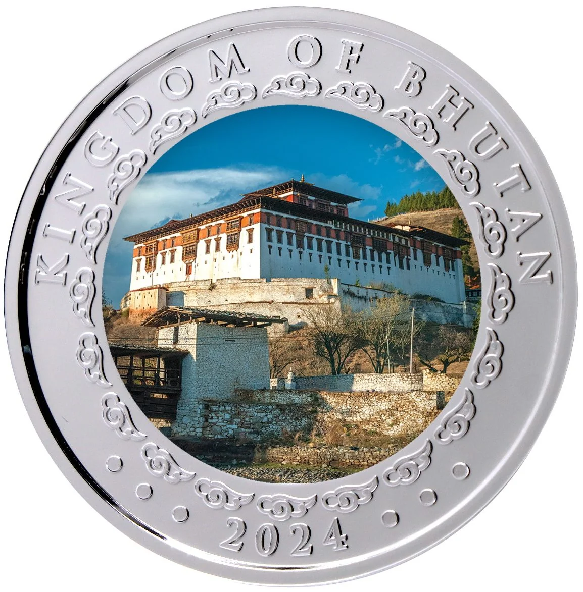The majestic dragon, symbolizing royalty and strength, is adorned with Bhutan's natural swirls.