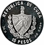 Cuban coat of arms with country name above, face value below, and fineness and weight on the sides.