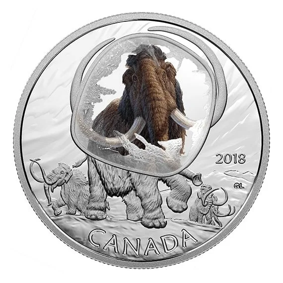 Frost-domed mammoth facing forward, herd in background.
