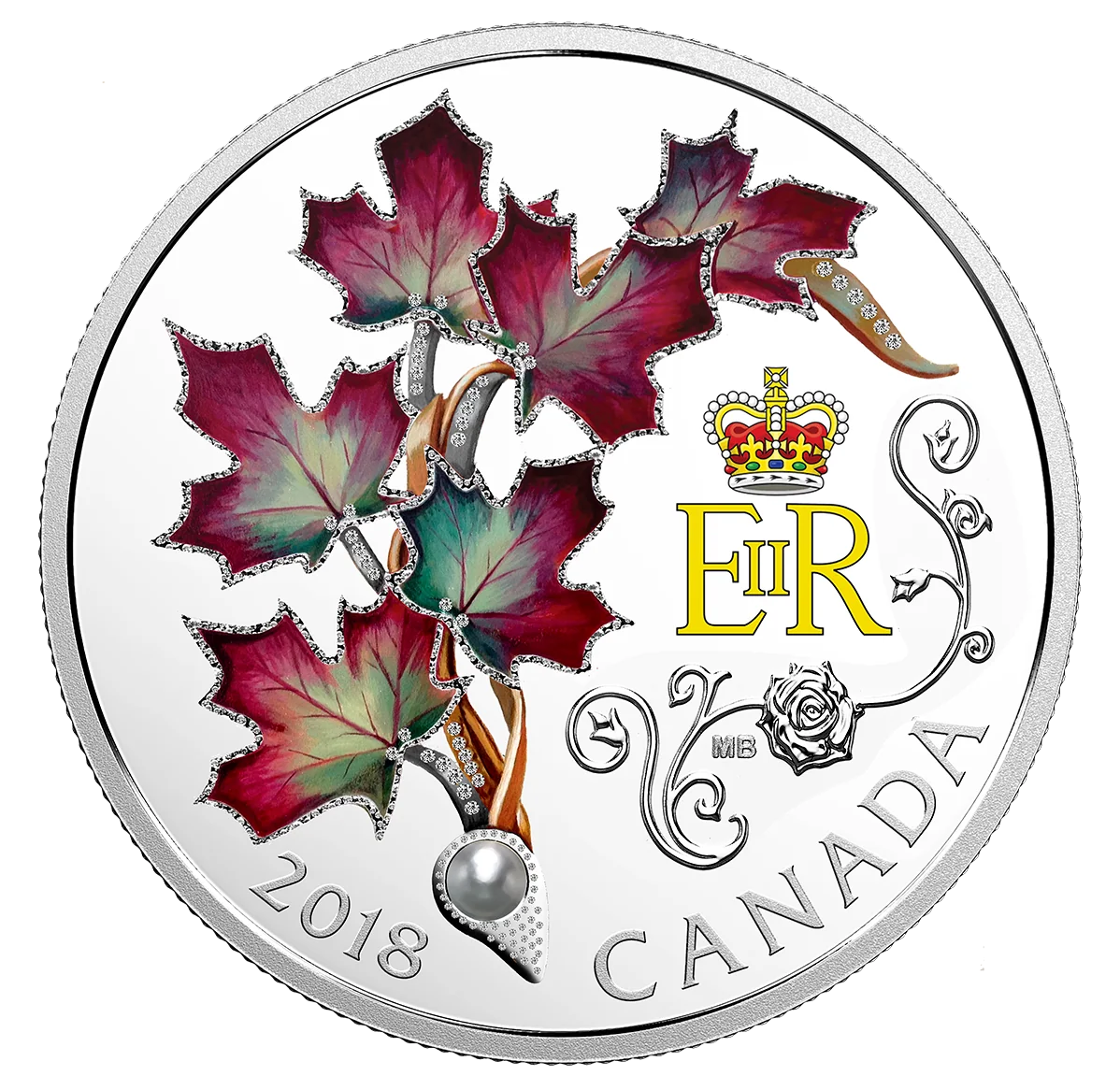 Six enamel maple leaves encircling a Swarovski crystal pearl.