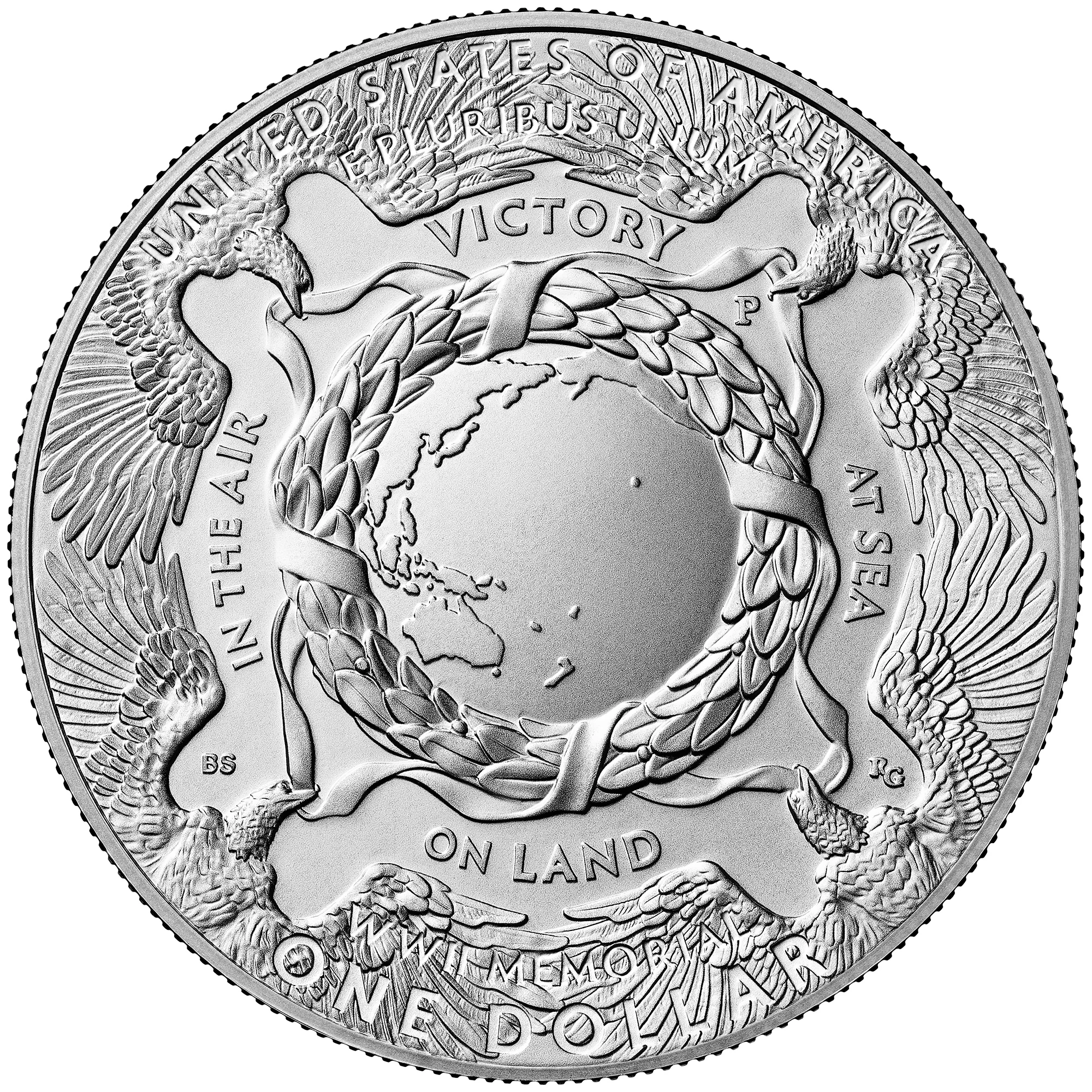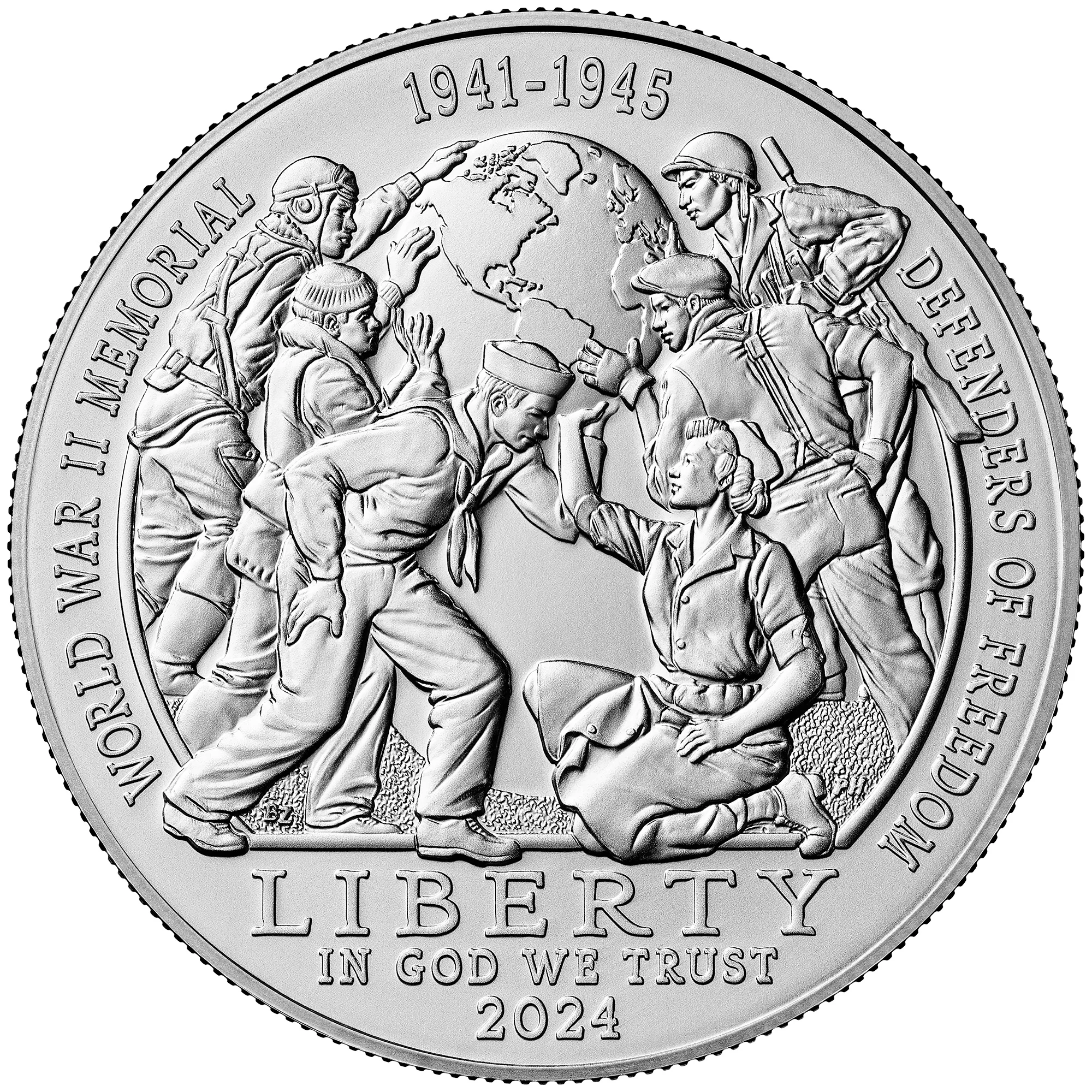 The obverse depicts six figures supporting the Earth, representing the collaborative efforts of the Army, Navy, Army Air Forces, Marine Corps, Coast Guard, and Merchant Marine during World War II.