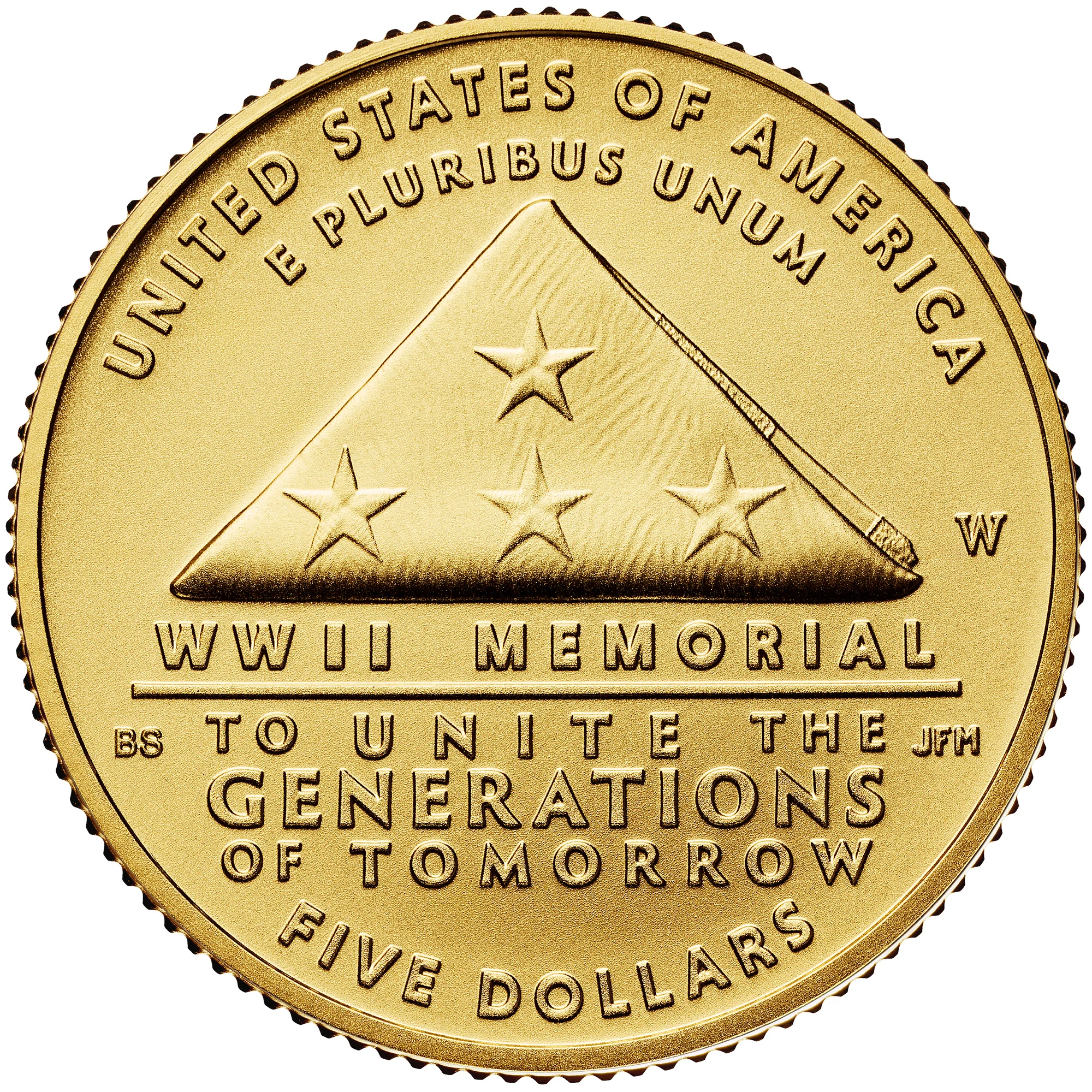 The obverse shows a section of the WWII Memorial's Wall of Stars and an olive branch, where each star honors 100 American lives lost and the branch symbolizes the ensuing peace.