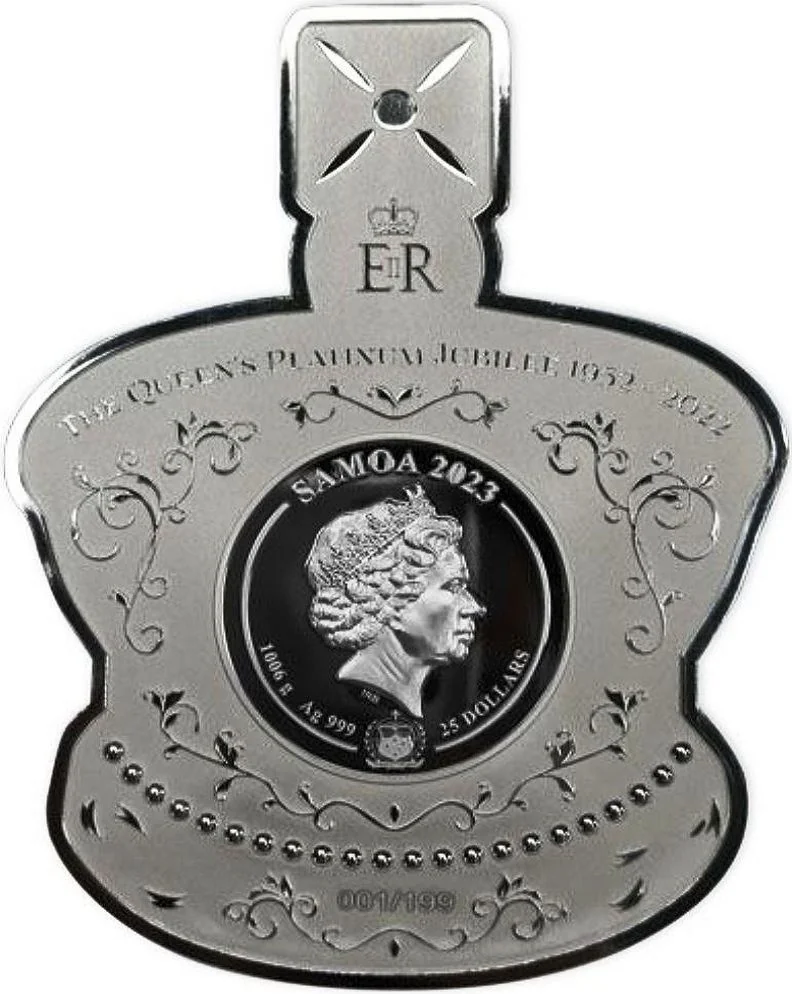 Queen Elizabeth II facing right, Samoan coat of arms below, surrounded by vines.