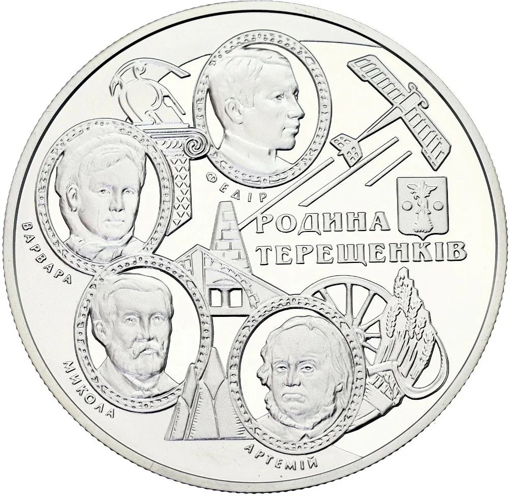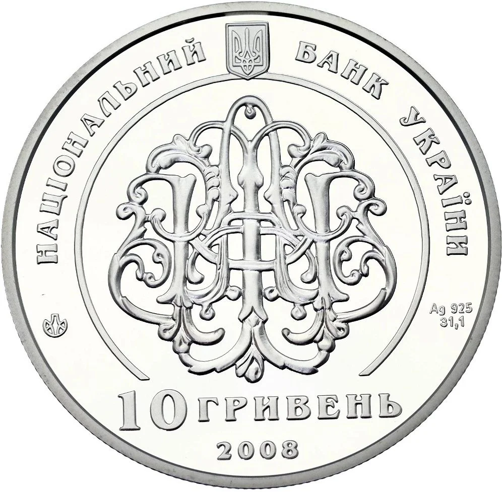 Description: The obverse features the Small National Emblem of Ukraine, surrounded by the inscription "Національний банк України". Below, Ag 925 and 31.1 (right) flank the Mint's logotype (left). The center displays Mykola Tereshchenko's monogram, with the face value and year, 10 гривень/2008, beneath.