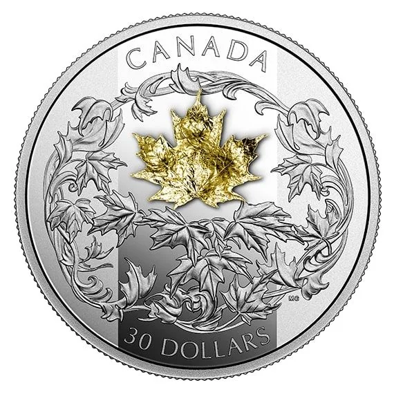 A .750 gold maple leaf encircled by a leafy vine.