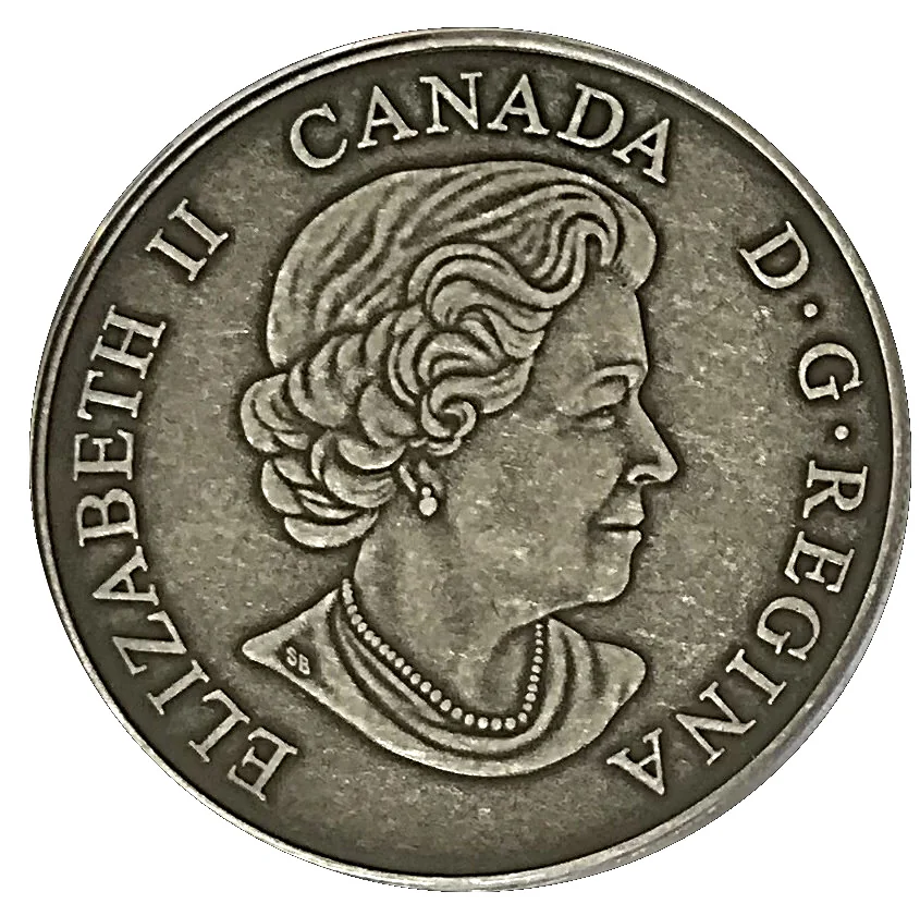 The 2018 Newfoundland 5 Cents (KM# 2) replicates an 1880 design, featuring its denomination and date within an ornamental arabesque frame.