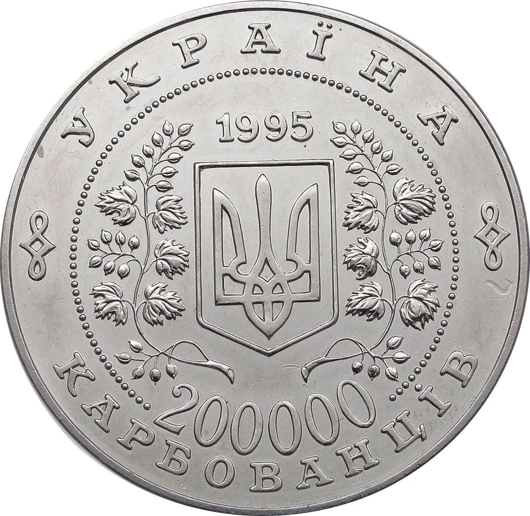 Description: The obverse features Ukraine's Small State Emblem within a beaded circle, framed by guelder-rose sprays, with the year 1995 above. The circumferential inscriptions read "УКРАЇНА" at the top and "2 МІЛЬЙОНИ КАРБОВАНЦІВ" (or 200,000 Karbovanets) at the bottom. On the silver coin, "Ag 925" and "31,1" (the pure weight) appear below the emblem.
