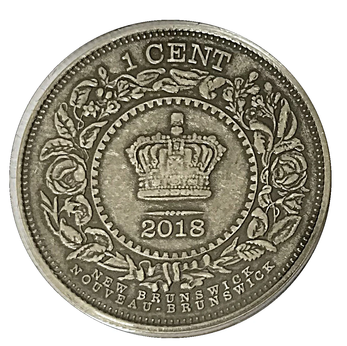 The New Brunswick Cent (KM# 6) closely resembles the Nova Scotia cent, featuring St Edward’s Crown within a wreath of roses and mayflowers, but lacks the rosebud on the lower right.