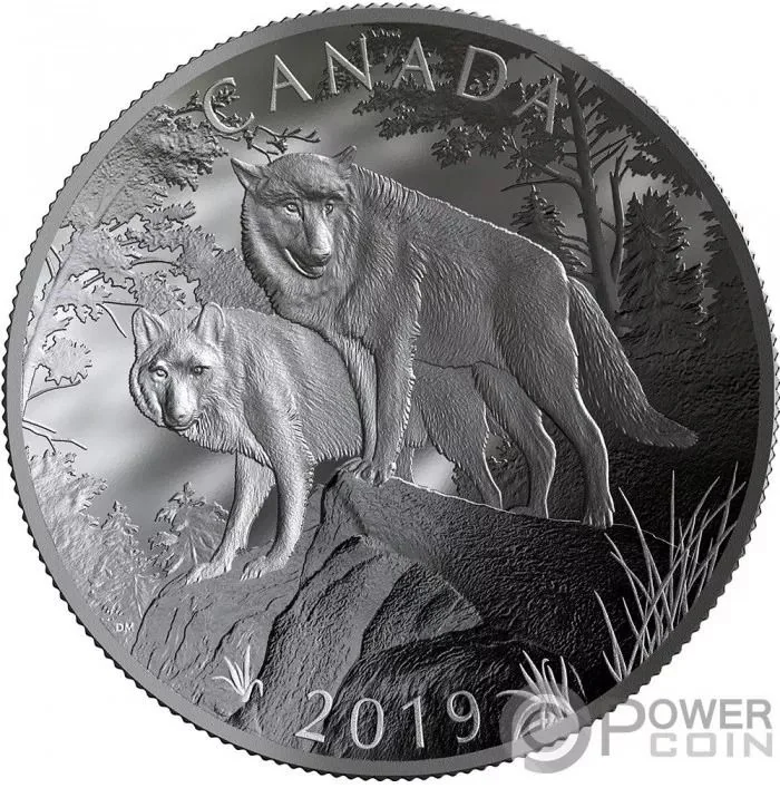 Two wolves on a rock: one gazing down, the other at you, with forest behind.