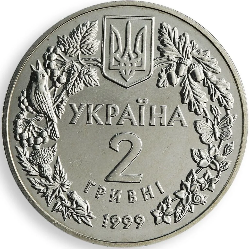 A wreath of native flora and fauna encircles the small National Emblem of Ukraine and the inscriptions: УКРАЇНА, 2 ГРИВНІ, 1999.