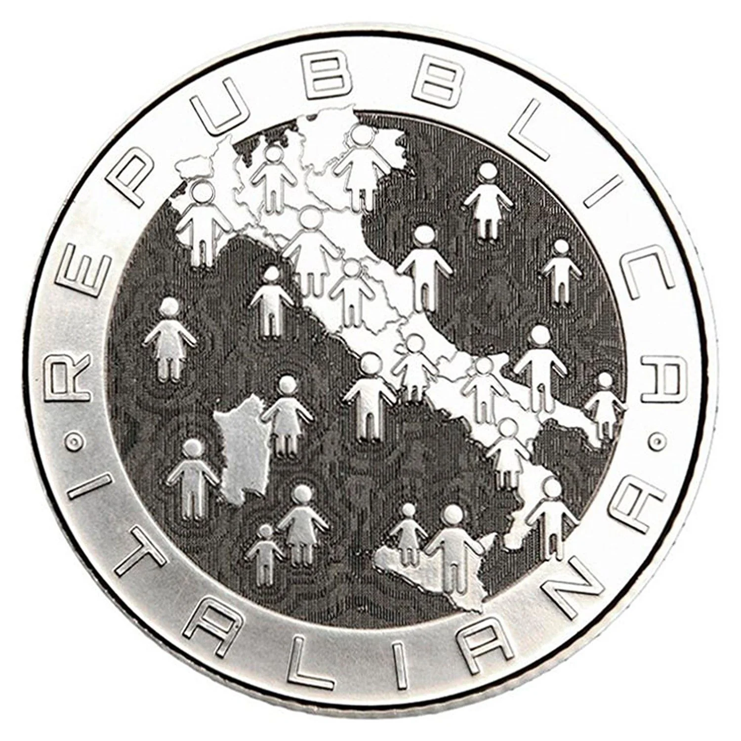 Italy’s demographic growth shown via latent-image male/female pictograms. Surrounded by “REPUBBLICA ITALIANA”.