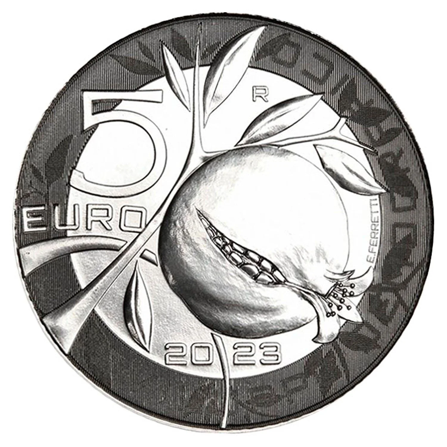 A pomegranate on a branch, symbolizing abundance, with leaves and the latent inscription “SVILUPPO DEMOGRAFICO”. It features “5 EURO”, the Rome Mint “R”, designer “E. FERRETTI”, and the year “2023”.