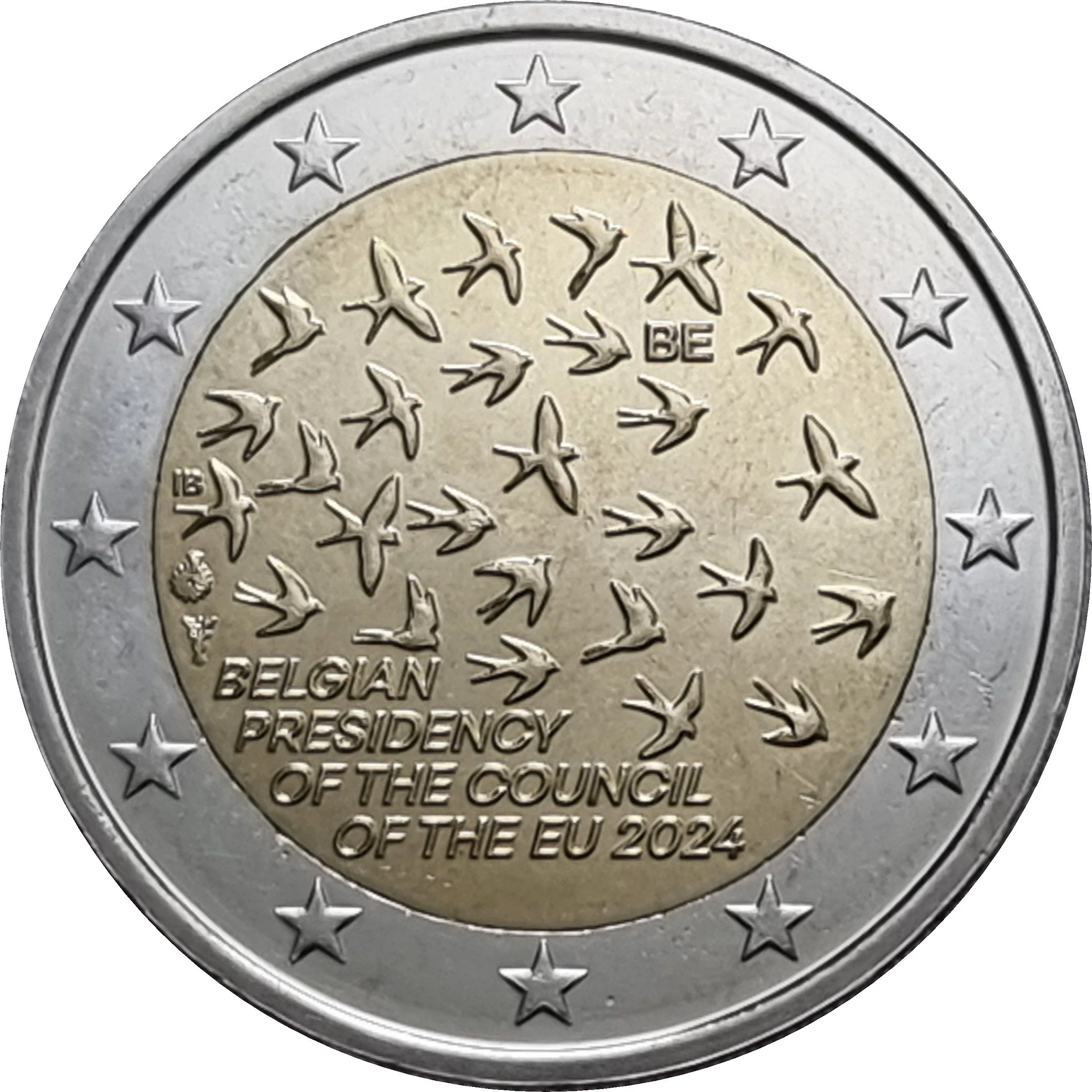 Left: 'BELGIAN PRESIDENCY OF THE COUNCIL OF THE EU 2024'. Center: 27 swallows (member states) swarm around 'BE', symbolizing unity, diligence, and loyalty. Right: Designer initials 'IB', mintmaster's mark (flask with aster), and Royal Dutch Mint mark (Mercury staff).