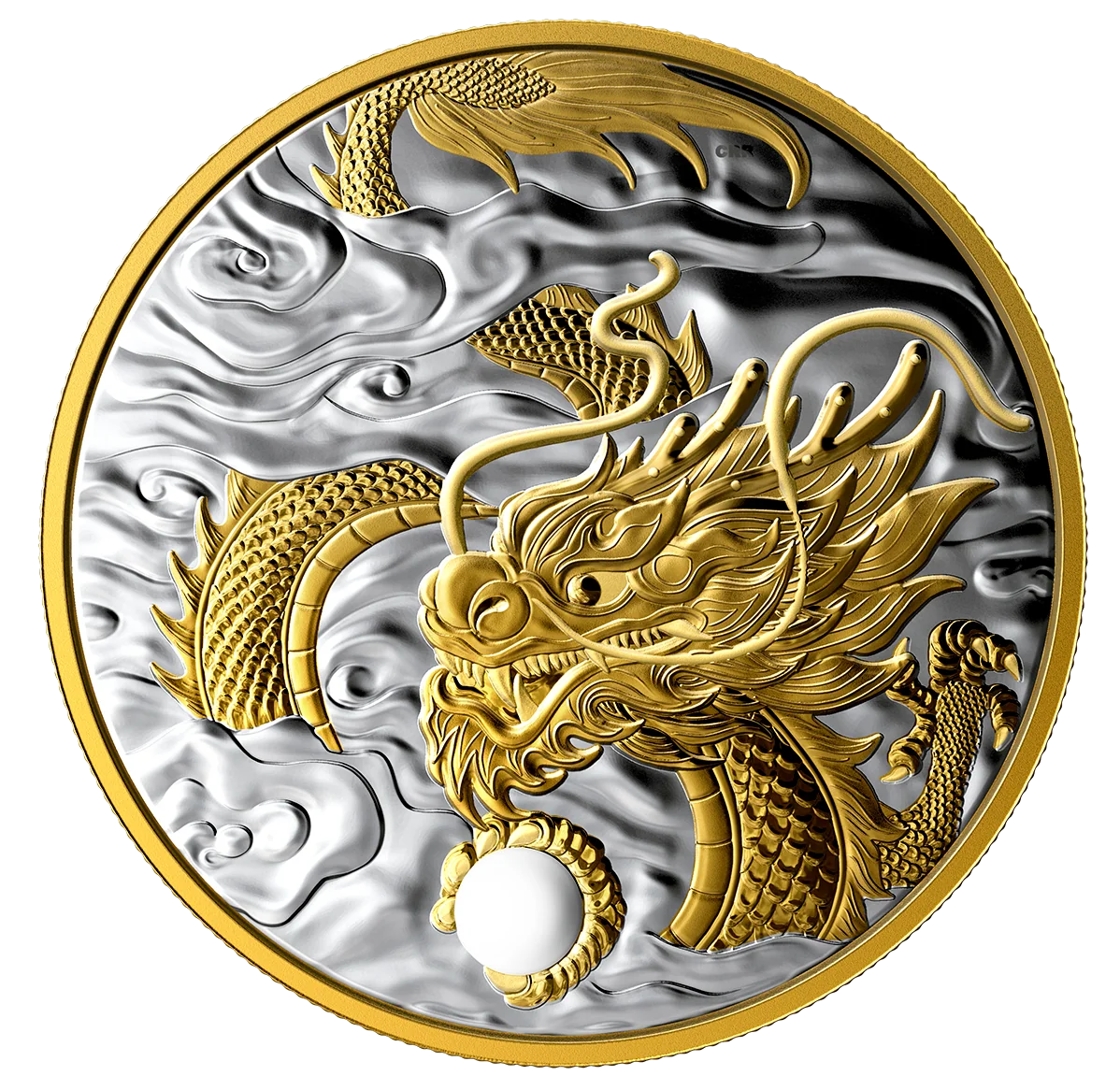 A gold Chinese dragon holds a pearl amid clouds.