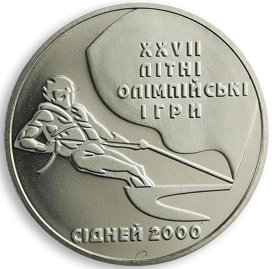 Ukraine's national emblem on a banner with sports-themed ribbon.
