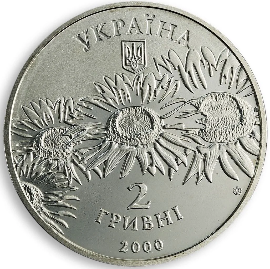 Sunflowers, Ukraine's small National Emblem, the NBU Mint logo, and inscriptions: УКРАЇНА, 2, ГРИВНІ, 2000.