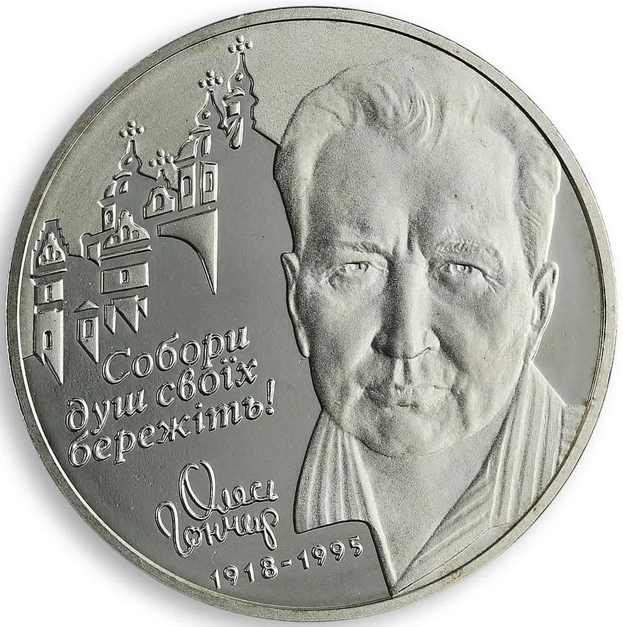 Left: a cathedral and the inscription "Protect the temples of your souls!" Right: a bust of the writer Oles Honchar (1918–1995).