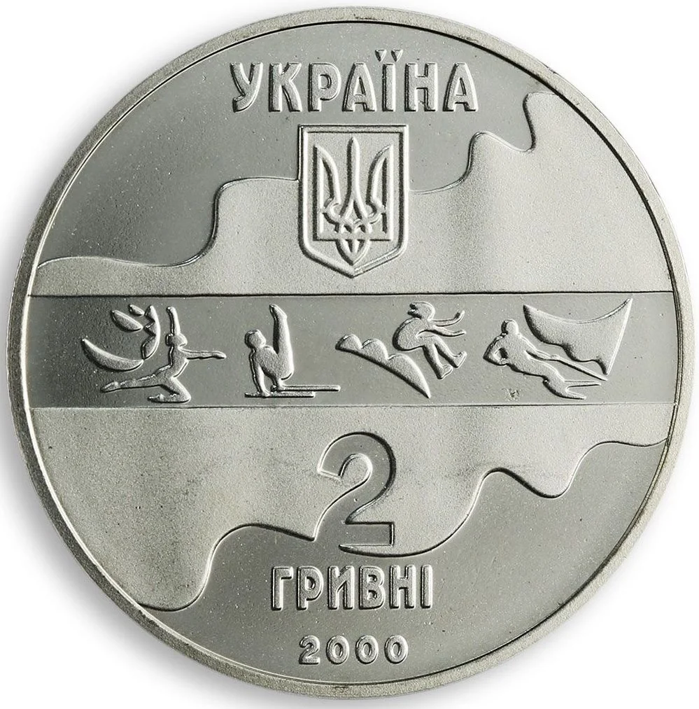 A small Ukrainian emblem on a banner with sports imagery, ribbon, and the inscription: УКРАЇНА / 2 / ГРИВНІ / 2000.
