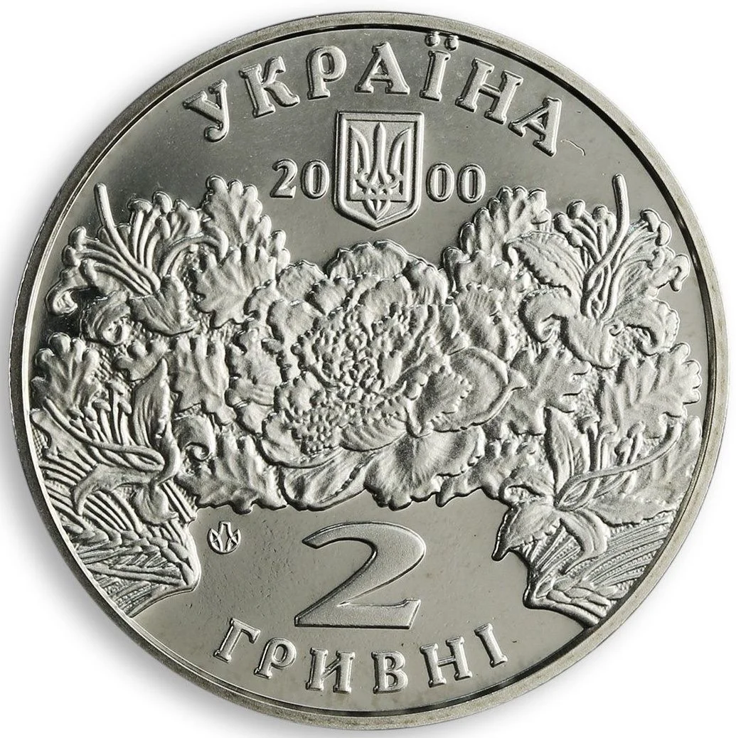 Ukraine’s small National Emblem, a floral field inspired by the artist’s paintings, with inscriptions: УКРАЇНА, 2000, 2 ГРИВНІ, and the Mint logo.
